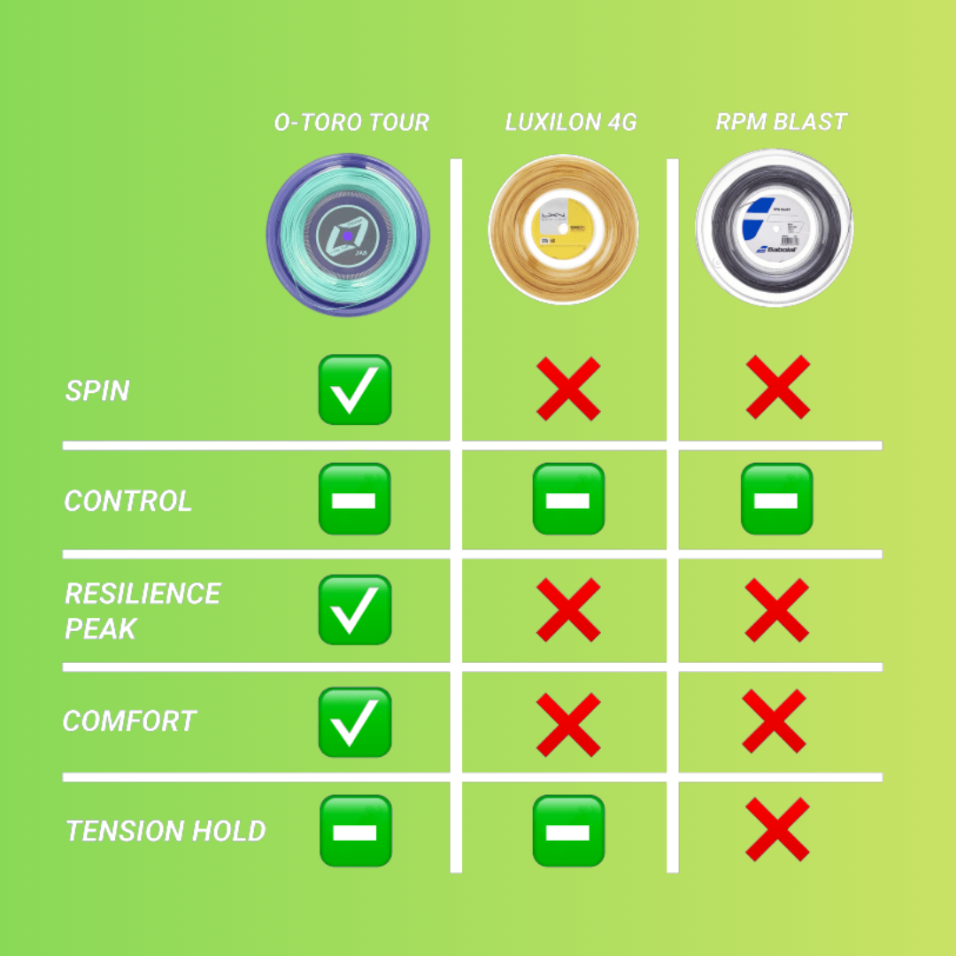 Former Top 25 ATP Pro, Steve Johnson has been busy in the lab refining our best seller, O-TORO. Designed for the advanced level player, O-TORO TOUR has approximately a 15% increase in stiffness (comparable to Luxilon 4G and RPM Blast) resulting in more control, stability and durability. Not only did O-TORO Tour lab test higher in spin than Luxilon 4G and RPM Blast, but also tested higher in comfort. The increased stiffness enhances the string's responsiveness and stability at higher swing speeds. Also complements rackets with a softer flex (RA rating) or players that string at low tension.